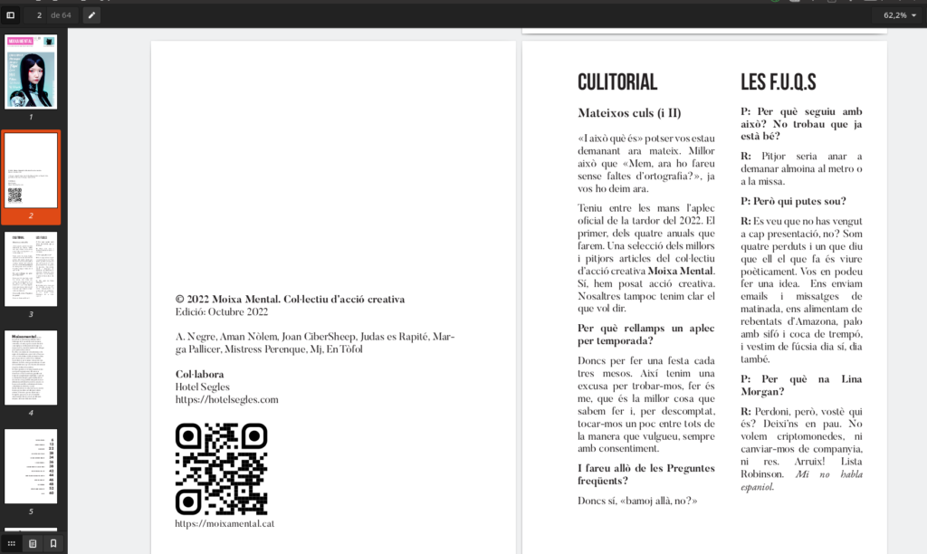 Moixa Mental va néixer com a col·lectiu quan una banda d’arreplegats es proposà el desafiament pandèmic quotidià de publicar en paper i mensualment, un opuscle eclèctic. Durant un any i sota el nom de Cerebreco, la publicació reunia relats, en català majoritàriament, il·lustració, crítica cinematogràfica, humor absurd i fotografia. Després d’aquest any, els 12 números editats es varen publicar en paper. Ara, ja com a Moixa Mental, presentam el primer aplec, com a grup consolidat.