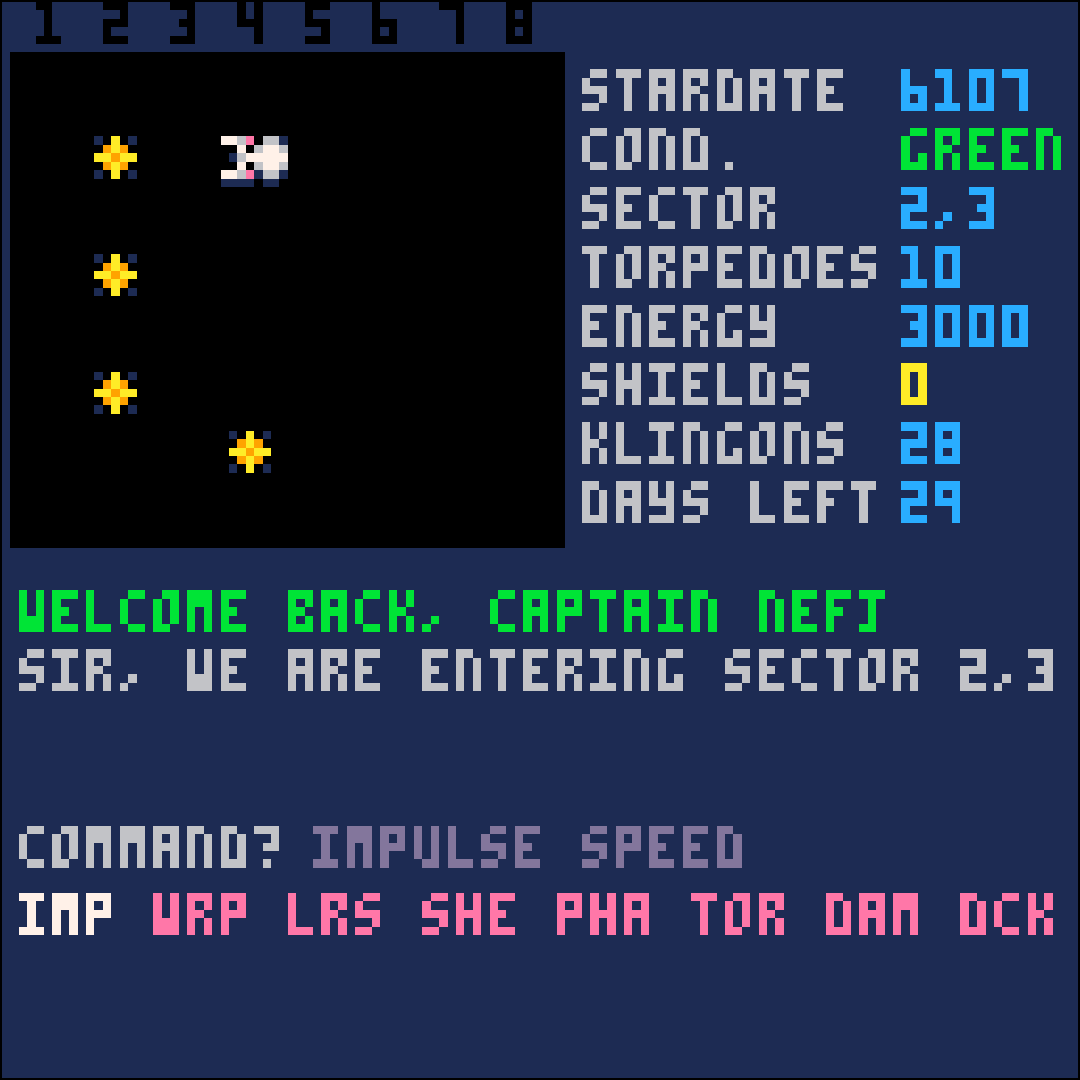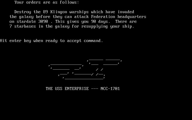 El joc és bastant senzill: hem de destruir les naus klingons que hi ha al mapa estel·lar sense ser destruïts i en el temps indicat (2 Gene Roddenberrys).